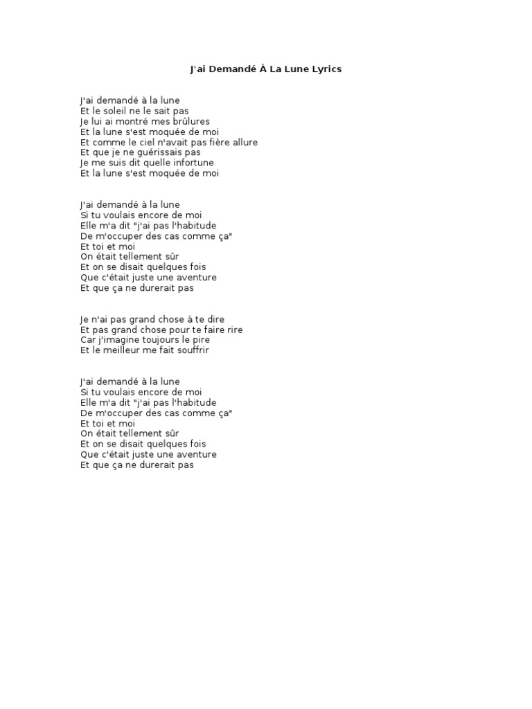 Web Jai demandé à la lune Et le soleil ne le sais pas Je lui ai montré mes brûlures Et la lune sest moquée de moi Et comme le ciel navait pas fière allure Et que je ne guérissais pas. Web Jai demandé à la lune English translation Artist. Web Jai demandé à la lune Lyrics.